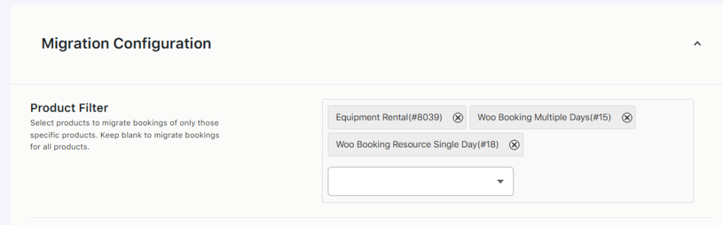 If one or more products are selected, only bookings associated with those products will be included in the migration. If no product is selected, the tool will migrate bookings for all available products by default.