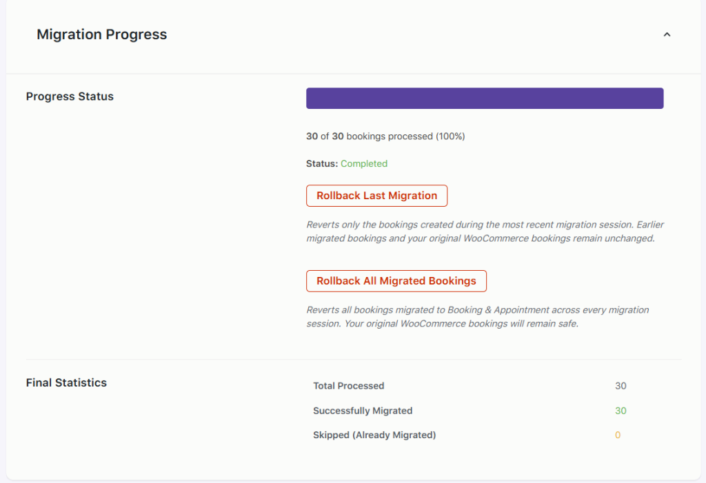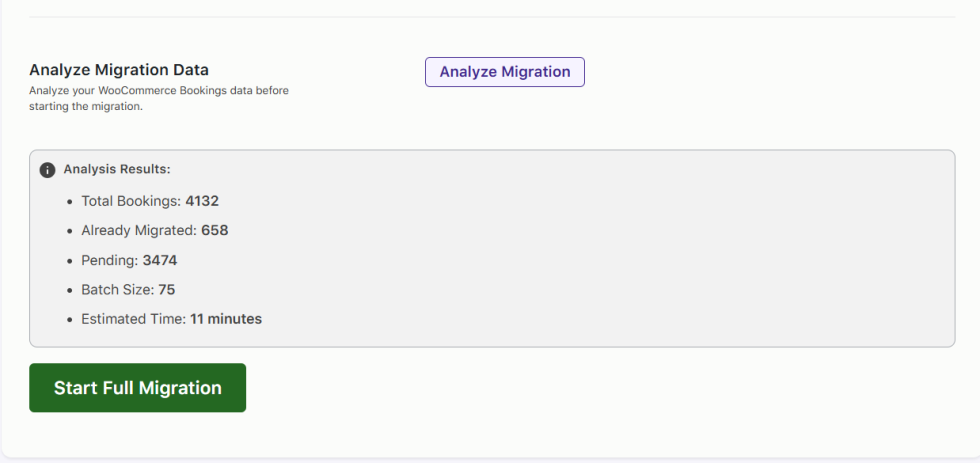 ↑ Back to topThe Analyze Migration option provides a detailed overview of the existing WooCommerce Bookings data before starting the migration.