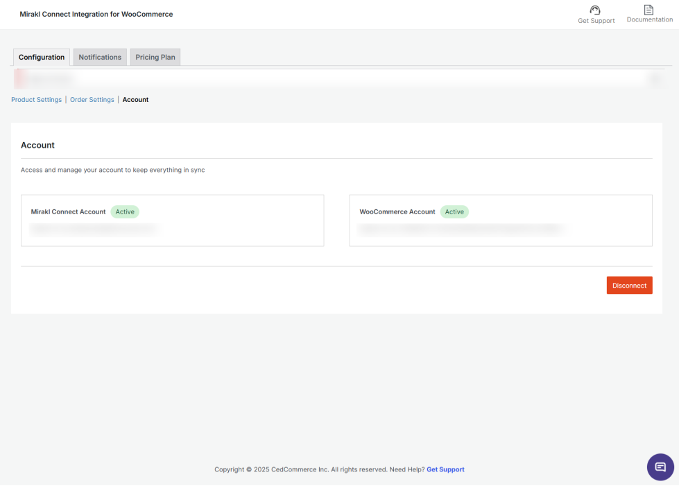 In this section, you can check which Mirakl Connect and WooCommerce accounts are active. You also have the option to ‘disconnect’ your WooCommerce account from the connector.