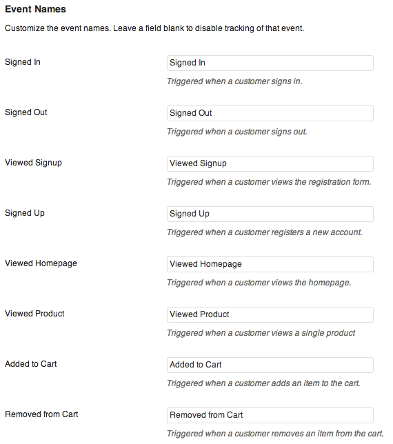 To disable tracking of a particular event, clear the text field associated the event.