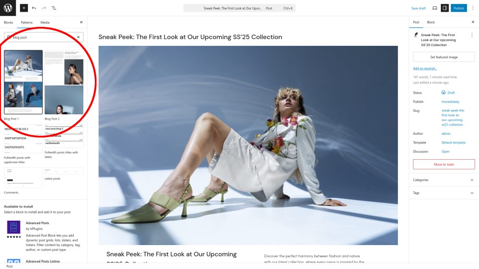 Blog Post 1orBlog Post 2. The blog post pattern you select will be inserted into your new post.