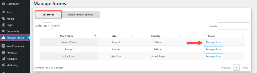↑ Back to topAt the backend, go to Manage Store > All Stores to see all the added stores and click the “Manage Store” button to manage a specific store.