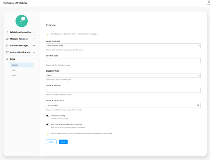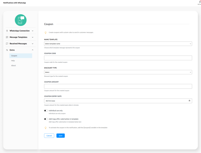To activate the coupon in the notification, add the {{coupon}} variable in the template