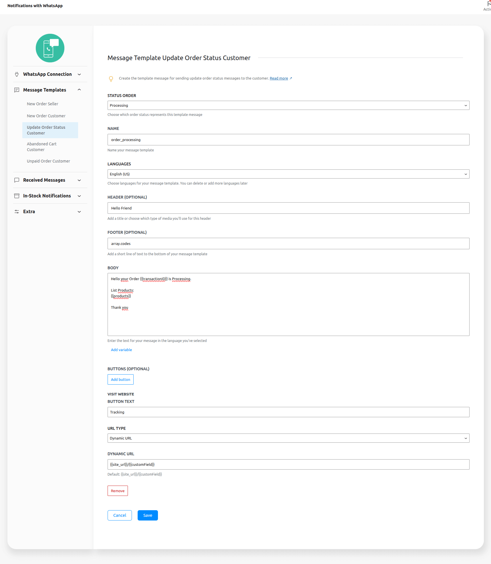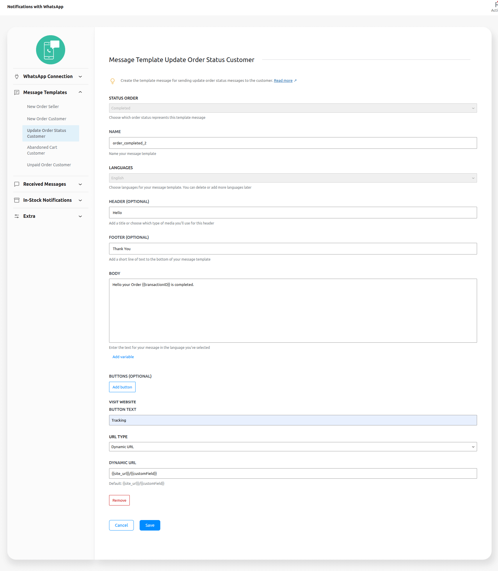1 – Create a message template for the order completion status, with a dynamic link button to send the user to the tracking link.