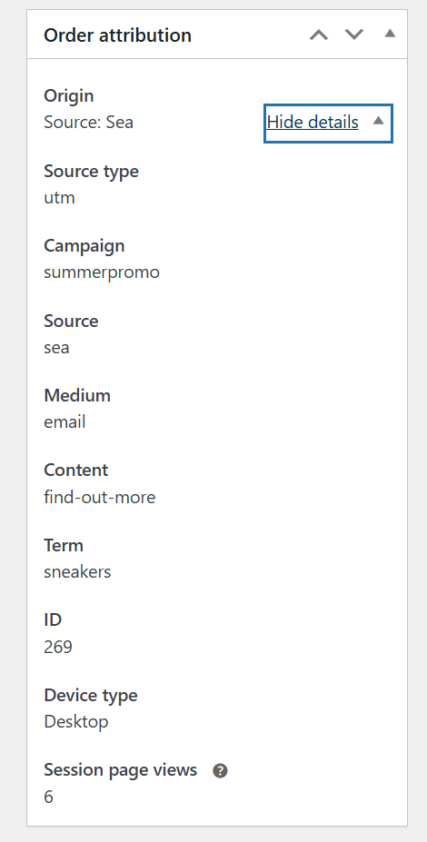 ↑ Back to topOutside these new reports, you can see order attribution data in other places as well. Within the order edit page for each new order, you’ll find two meta boxes — “Order attribution” and “Customer history.” These boxes provide more information on the origin of the order and offer a detailed history of the customer’s interactions with your store. These meta boxes show the following information: