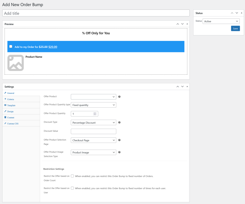 - By default, a single Order Bump can be used for any number of orders. If you want to restrict the number of times a single order bump is used, you can do so by enabling the “Restrict the Offer based on Order Count” option and setting the value in “Maximum Number of Orders to be Applied” option.