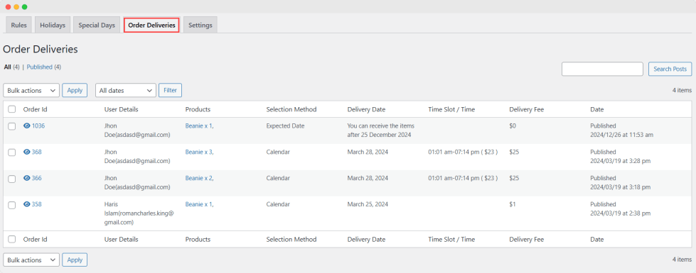 From WooCommerce > Delivery Date and Time > Order Deliveries, you can view all orders with their IDs and easily track progress. Perform bulk actions on deliveries to save time.