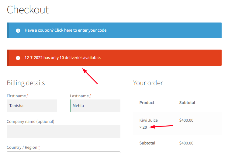If the customer places the order with 20 quantities, then they will not be able to do so. This is because the maximum deliveries per day is set to 20 & an order was already placed for 10 quantities earlier. Thus, an error message will be displayed on the checkout page when the customer clicks on the ‘Place Order’ button.