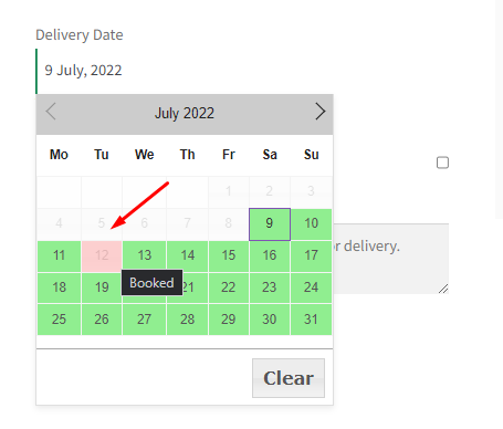 Now, if the orders for 20 product quantities are all placed, the delivery date will be disabled in the calendar for any future deliveries. The date in the calendar will be marked with the ‘Booked’ label:
