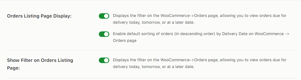 Enable the toggles for ‘Orders Listing Page Display’ and ‘Show Filter on Orders Listing Page as shown below:
