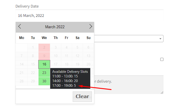 ↑ Back to topLet’s say that a customer has chosen their items and has now reached the Checkout Page. When they select the Delivery Date as 16th March 2022, Wednesday, in the calendar, they’ll be able to see how many timeslots are available for them to choose from.