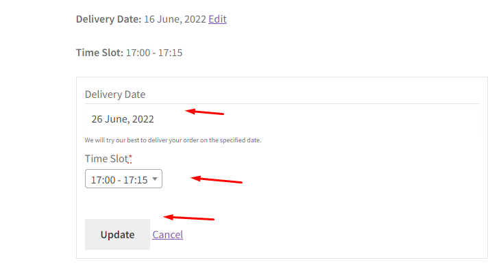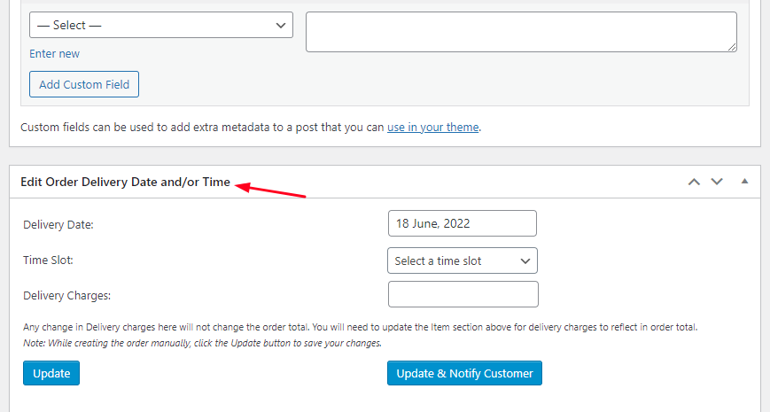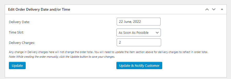 Admins can also edit the delivery dates from ‘Edit Order Delivery Date and/or Time’ metabox present under the Edit Order page.