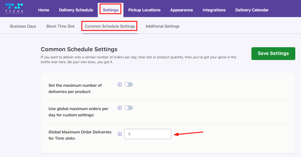 Now, for all the timeslots that do not have any limit, they wish to set limit of 5 deliveries only. So for this, they can go to the Settings tab -> Common Schedule Settings -> Global Maximum Order Deliveries for Time slot as shown below: