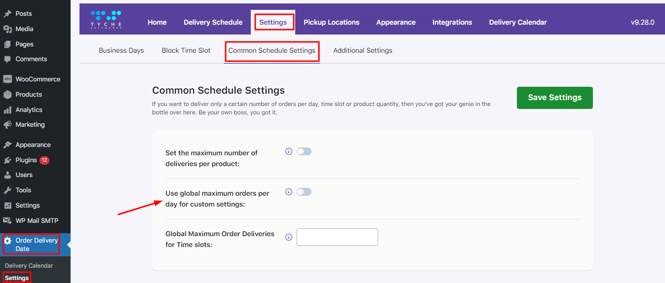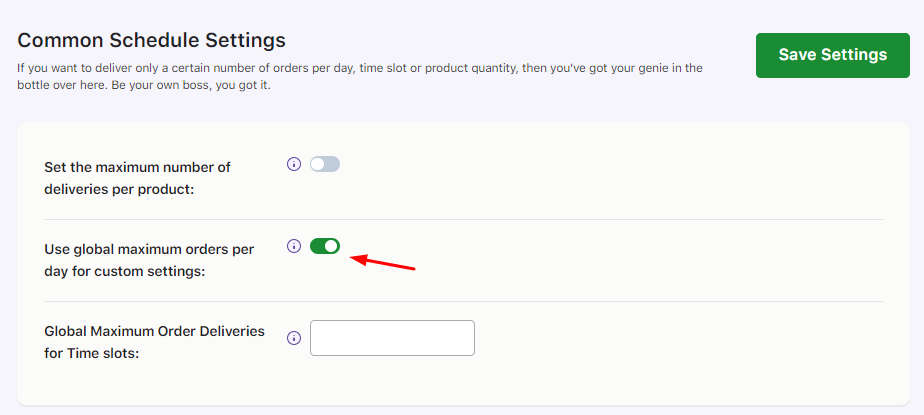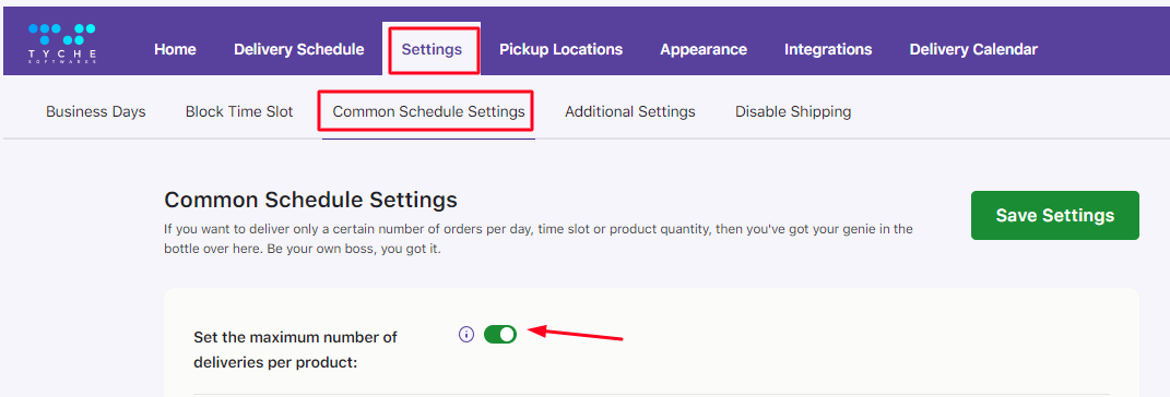 Once the limit per day is set for allowing only 20 product quantities for a date, you need to enable the Maximum number of deliveries per product toggle. To do this, go to Settings > Common Schedule Settings > Set the maximum number of deliveries per product. Enable it and click on the Save Settings button.