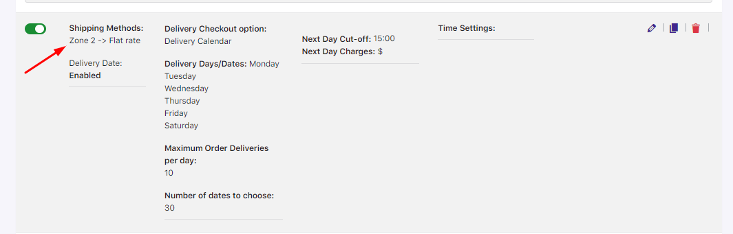↑ Back to topImagine you have an online meal delivery business. You need to deliver them in different zones with a different delivery schedule but you don’t have a set limit on how many orders you can deliver to a particular zone. So for this, you have created a Custom Delivery Schedule based on Shipping Methods via the Shipping Zone.