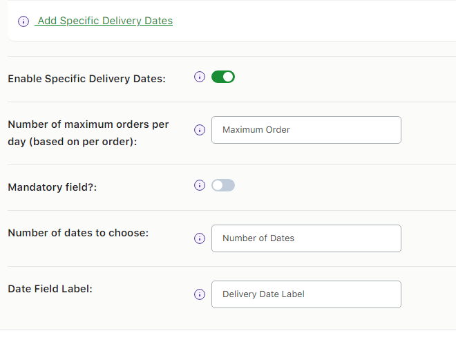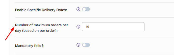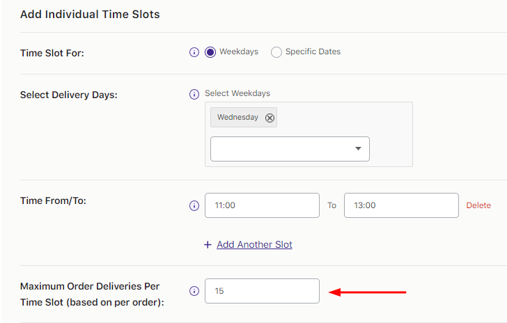 This setting will apply to all the individual timeslots in the custom delivery schedule that do not have their own individual maximum order per timeslot limit. If you wish to not set any limits for the remaining timeslots then you can simply keep this field blank.