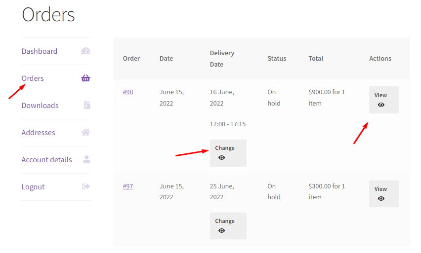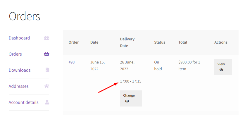 ↑ Back to topThe “View Delivery Details” section describes how you can view and sort all order deliveries on the WooCommerce Orders page. This functionality is useful for reviewing delivery details of all orders in a single go, thus allowing easy access to date and time data of order deliveries whenever required.