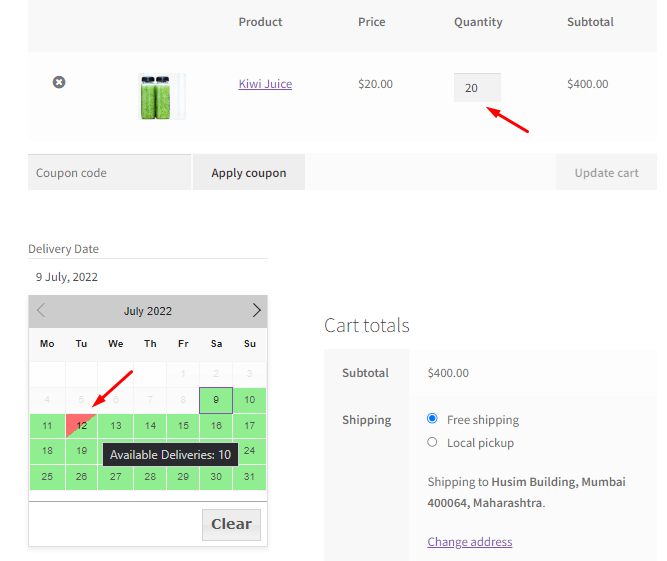 Once the above order is placed, another customer wishes to buy 20 quantities of this same product. They’ve added it into the cart and want it delivered on the same date, i.e., 12th July 2022. Once they hover over this date in the calendar, they’ll see that only 10 deliveries are available as shown here: