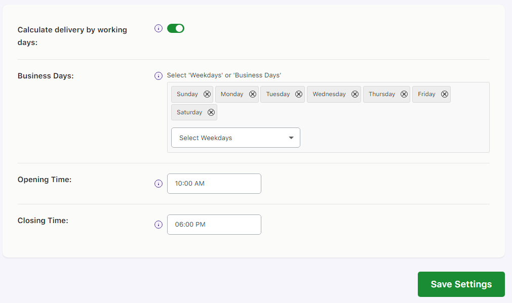 After making these changes, you can click on the Save Settings button. This would mean that your store is available to do business on all days from 10:00 am to 6:00 pm. This means the orders that would be placed by the customers in your store will be ready to send to your shipping company on these days.
