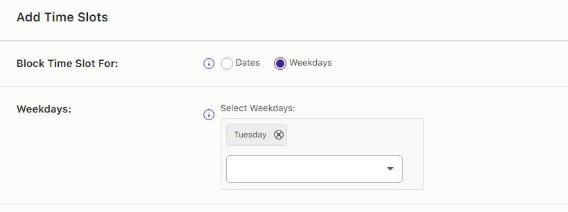 If you want to hide or block a time slot for a particular weekday, then you need to select Weekdays option of “Block Time slot for” setting.