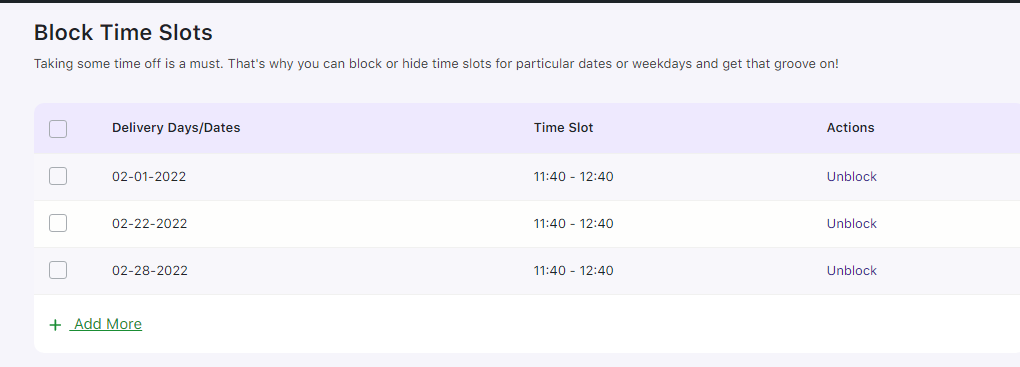 Once all the time slots are added for the dates or weekdays. If you want to delete any of the time slots which is not required, then you can select the checkbox next to the blocked time slots row and select the delete option in the bulk actions.