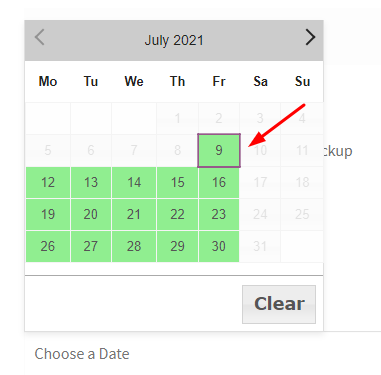 Due to the settings added by us, when the Pickup Date field is clicked, the calendar will let you select delivery dates between Thursday, Friday, Saturday and Sundays.