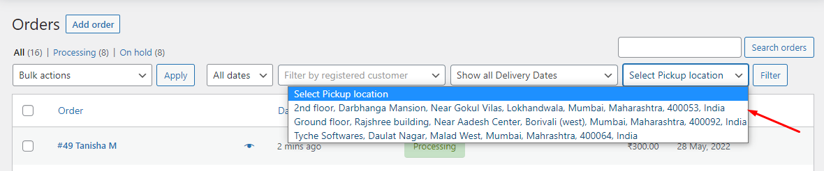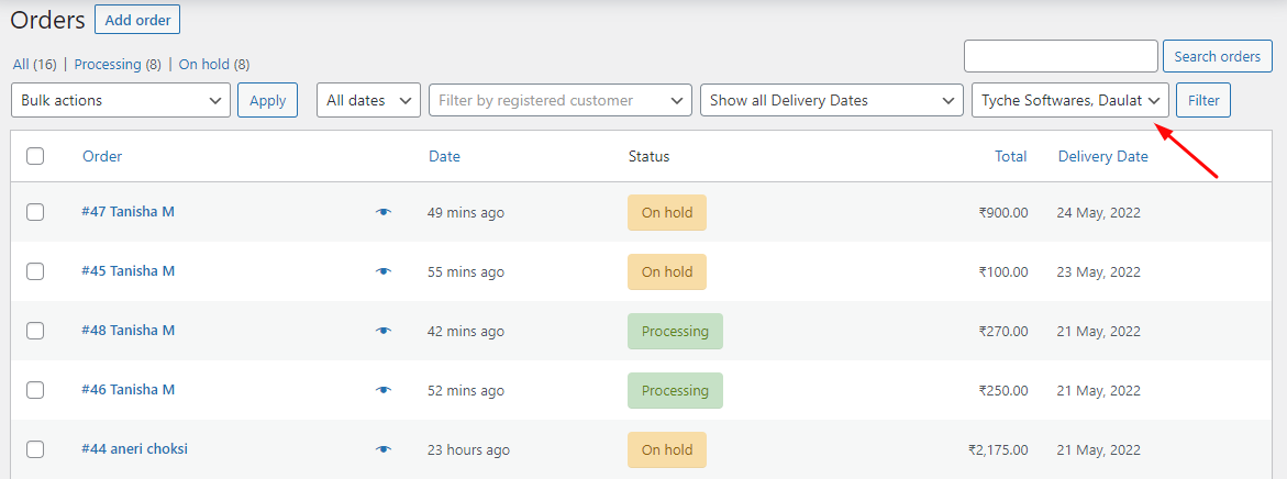 When the second option on Additional Settings page is enabled, the filter field ‘Show all Delivery dates’ will be added on the Orders page of WooCommerce as shown below: