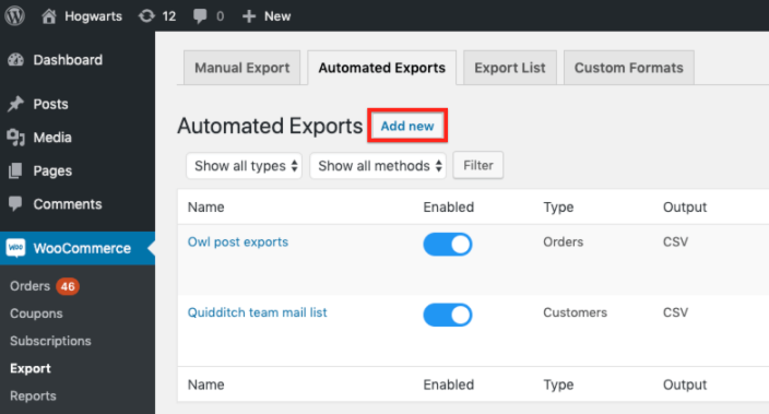 - Go to WooCommerce > Export > Automated Exports and click Add New.