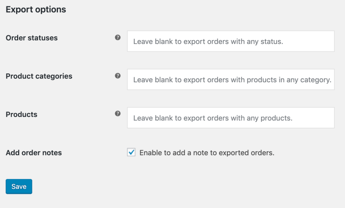 - Update the Export Options section to target particular orders (and include order notes), customers, or coupons. The available options will change based on your selected Output type.