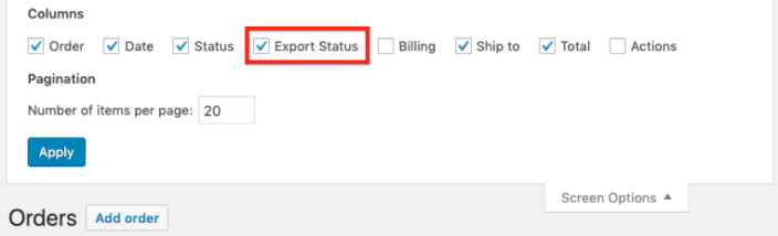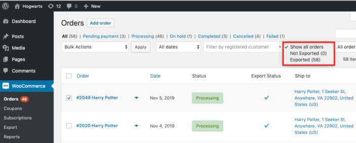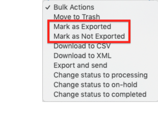 - Select one or more orders to export. You can set the Exported filter to show orders based on their export status.