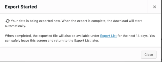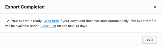 Note: If your site does not support background processing, your site is incapable of processing the export in the background. That means you’ll need to leave the export modal open while the export processes. Click here to read more about background processing and how to resolve this issue.