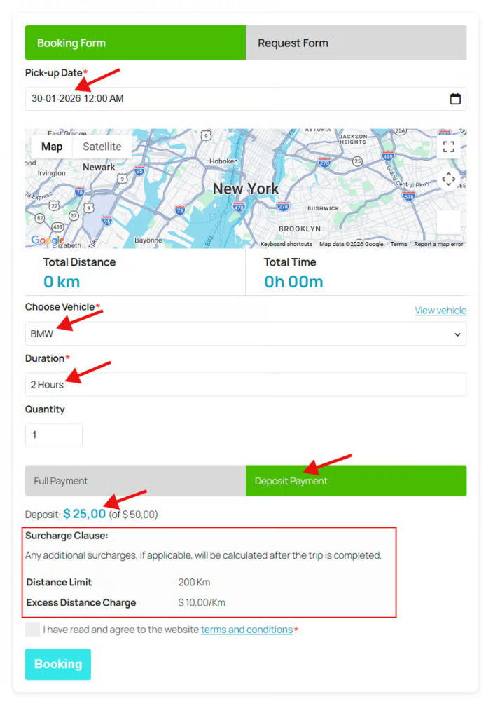 - Distance Limit of a duration: The maximum distance allowed within the rental period without additional charges. Example: 4 hours = 200 km included
