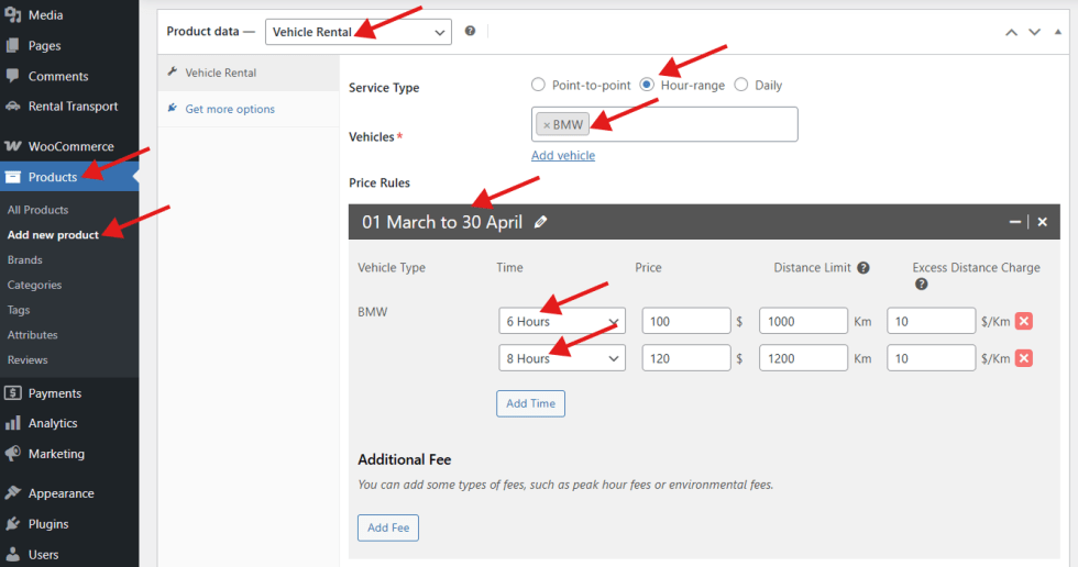 - Next, you move on to Product Data drop-down and select Vehicle Rental option.