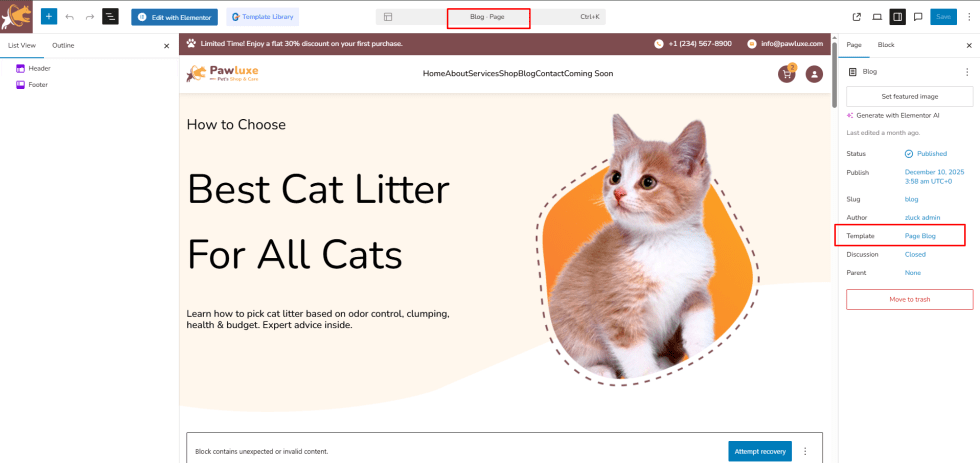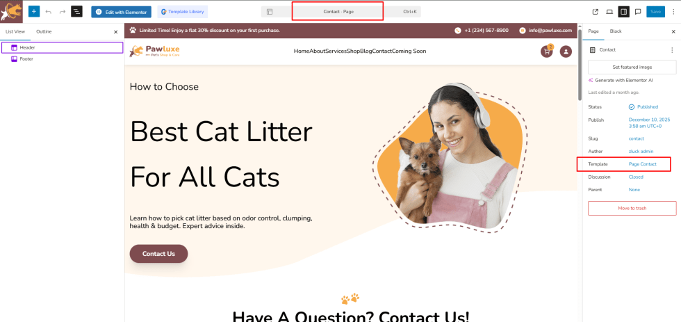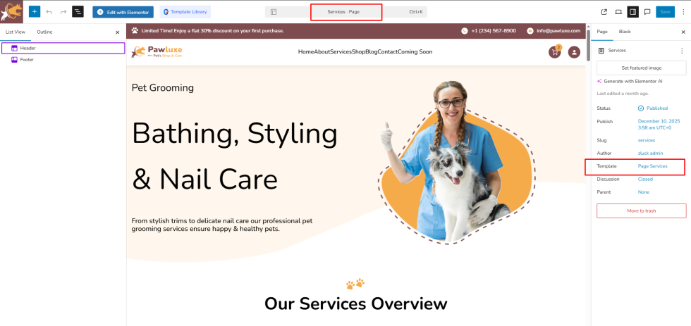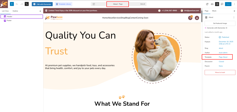 Pawluxe provides pre-built templates for all major pages. Simply create a new page, then assign the appropriate template from the Template dropdown. No pattern building required – the complete layout is applied instantly.