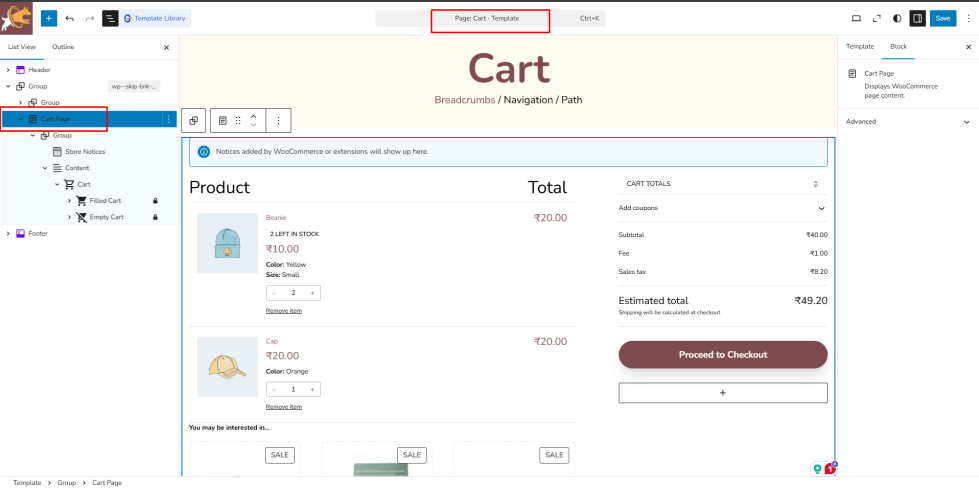 - You can edit it using the block editor to add custom notices, banners, or patterns above or below the cart table.