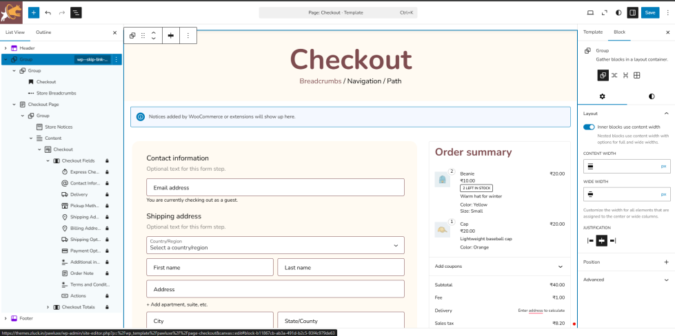 - To customize the layout globally, navigate to Appearance → Editor → Templates → Checkout.