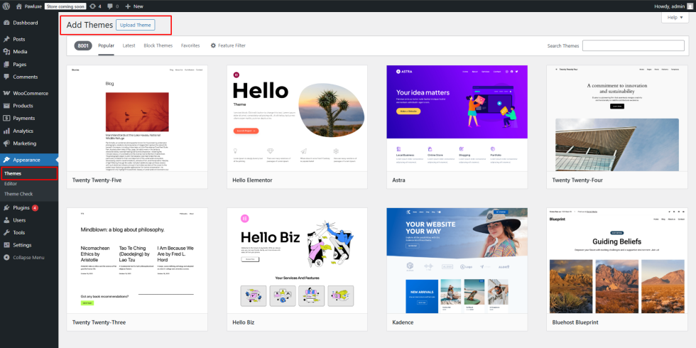 wp-content/themesdirectory. - After the upload is complete, go to Appearance → Themes in your WordPress dashboard and verify that Pawluxe appears in the list of installed themes.