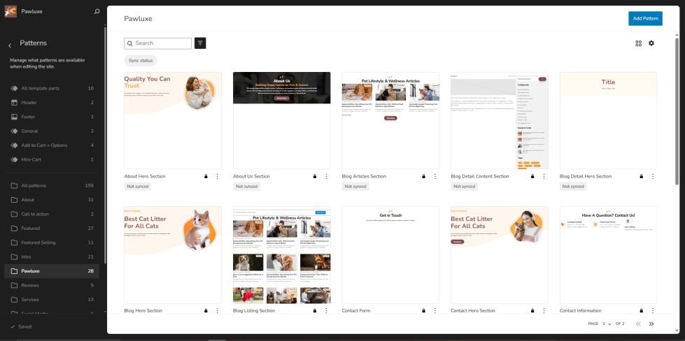 ↑ Back to topPawluxe includes 28 pre-designed block patterns specifically created for pet businesses. You can build complete pages by combining these patterns – no demo data import required.