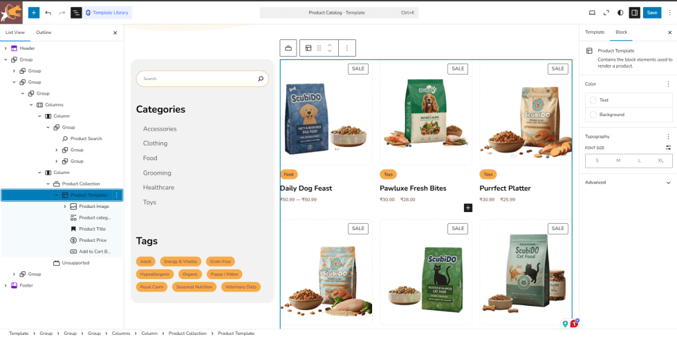 ↑ Back to topThe Products section is where you showcase everything your pet store has to offer – from premium pet food to toys, treats, grooming essentials, apparel, and accessories. In Pawluxe, products are powered by WooCommerce and displayed using beautifully crafted block-based layouts optimized for performance and visual consistency.