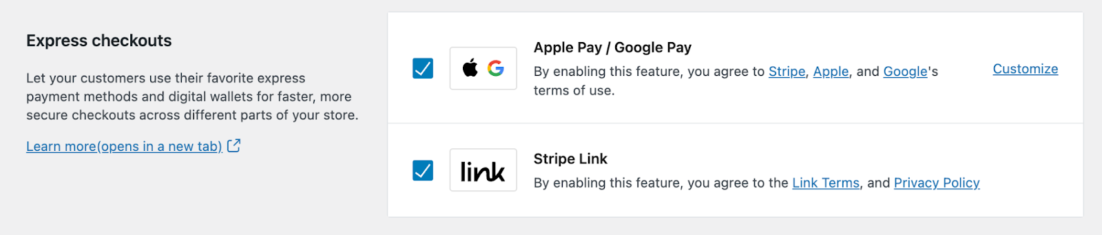 The Express Checkouts section of the settings page shows some features you can enable so that customers can purchase even faster. Enabling these features can help boost your sales and reduce abandoned carts, as they make it easier for customers to buy from your site. WooCommerce Payments currently supports Apple Pay, Google Pay, and Link by Stripe.