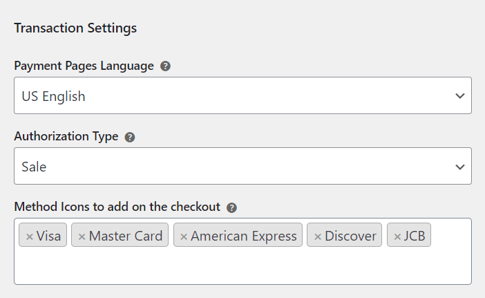 In the transaction settings you will quickly setup the hosted payment page language, the transaction authorization type and the icons you want to see on the Checkout page for the payment method.