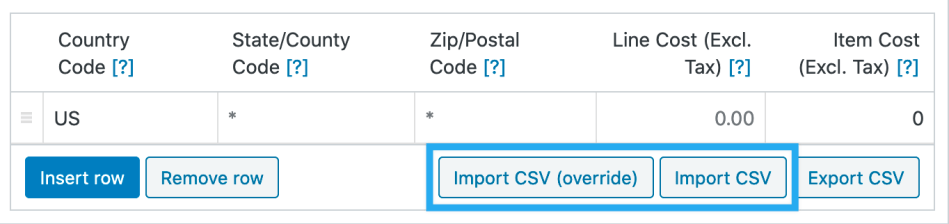 | Description | ID of the product this rate applies to | 2 Digit country code (if applicable) | 2 Digit state code (if applicable) | A single postcode or wildcard | Cost of shipping each line item | Cost for shipping each individual item |