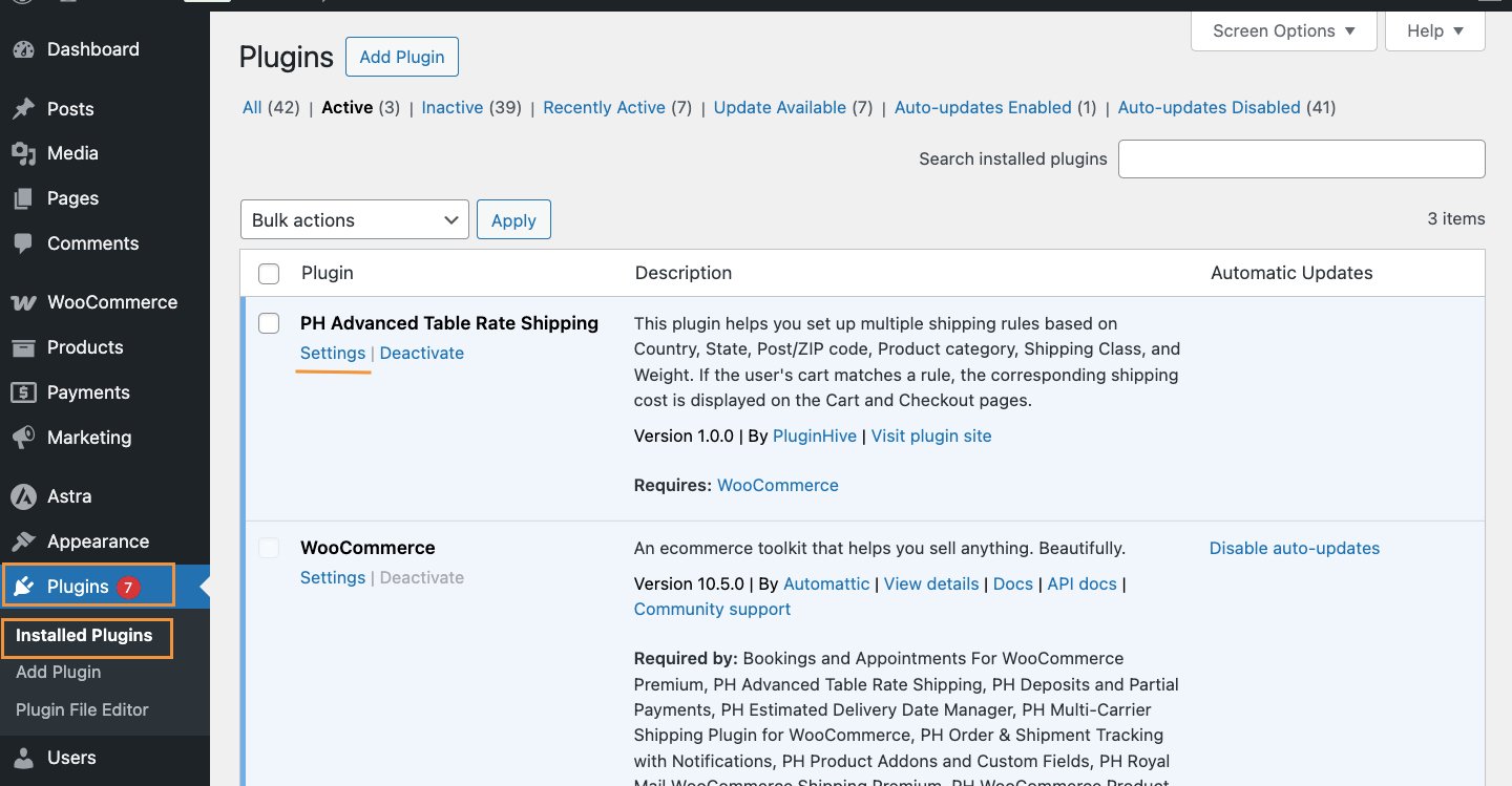 You can open the plugin settings directly from the WordPress admin dashboard. Go to Plugins > Installed Plugins, locate PH Advanced Table Rate Shipping, and click Settings next to the plugin name. This will take you to the Table Rate Shipping configuration screen.
