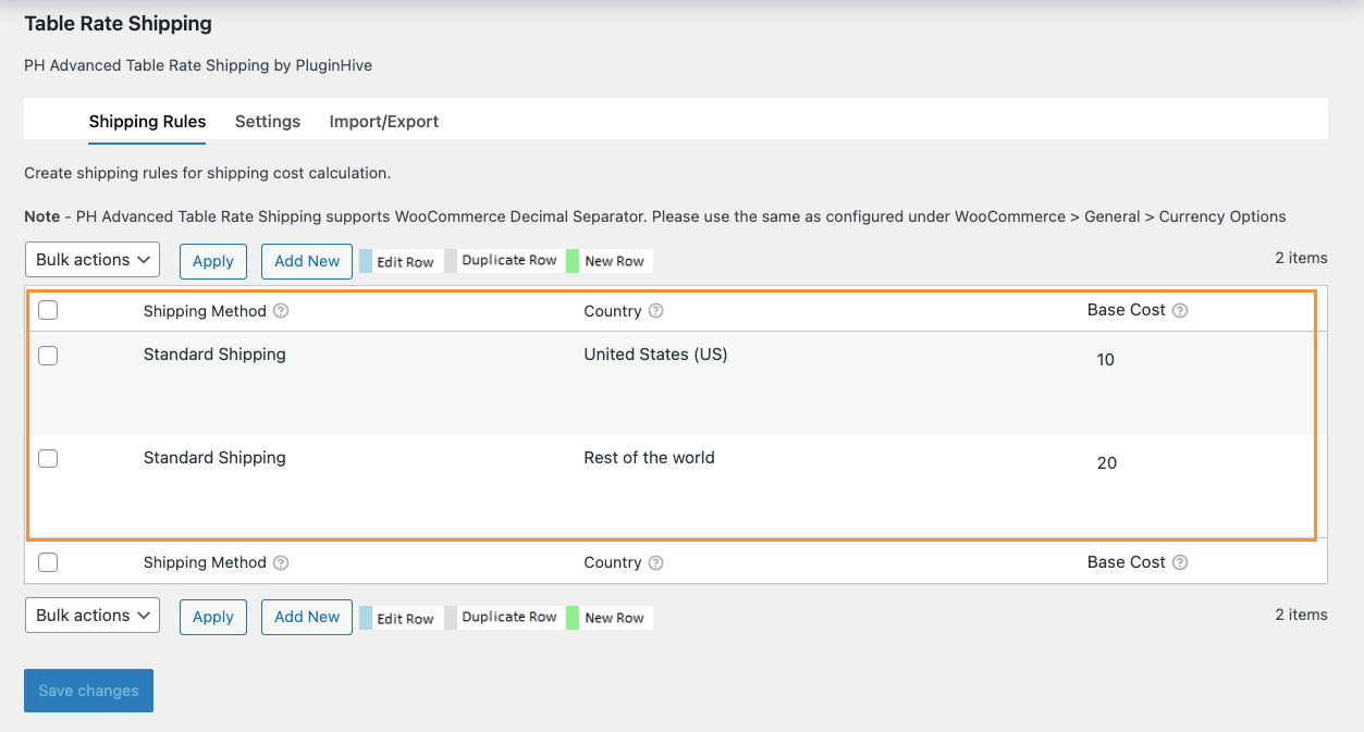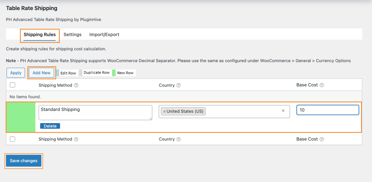 To create a new shipping rule, go to the Shipping Rules tab and click the Add New button above the table. A new empty row will appear where you can enter the required condition and cost details for your rule. After filling in the necessary fields, click Save changes to apply the rule.