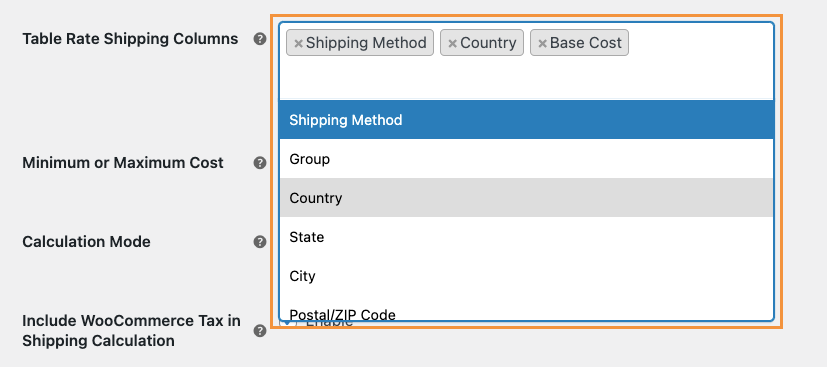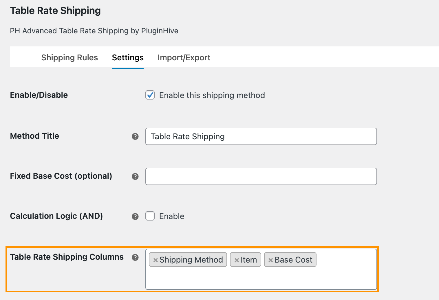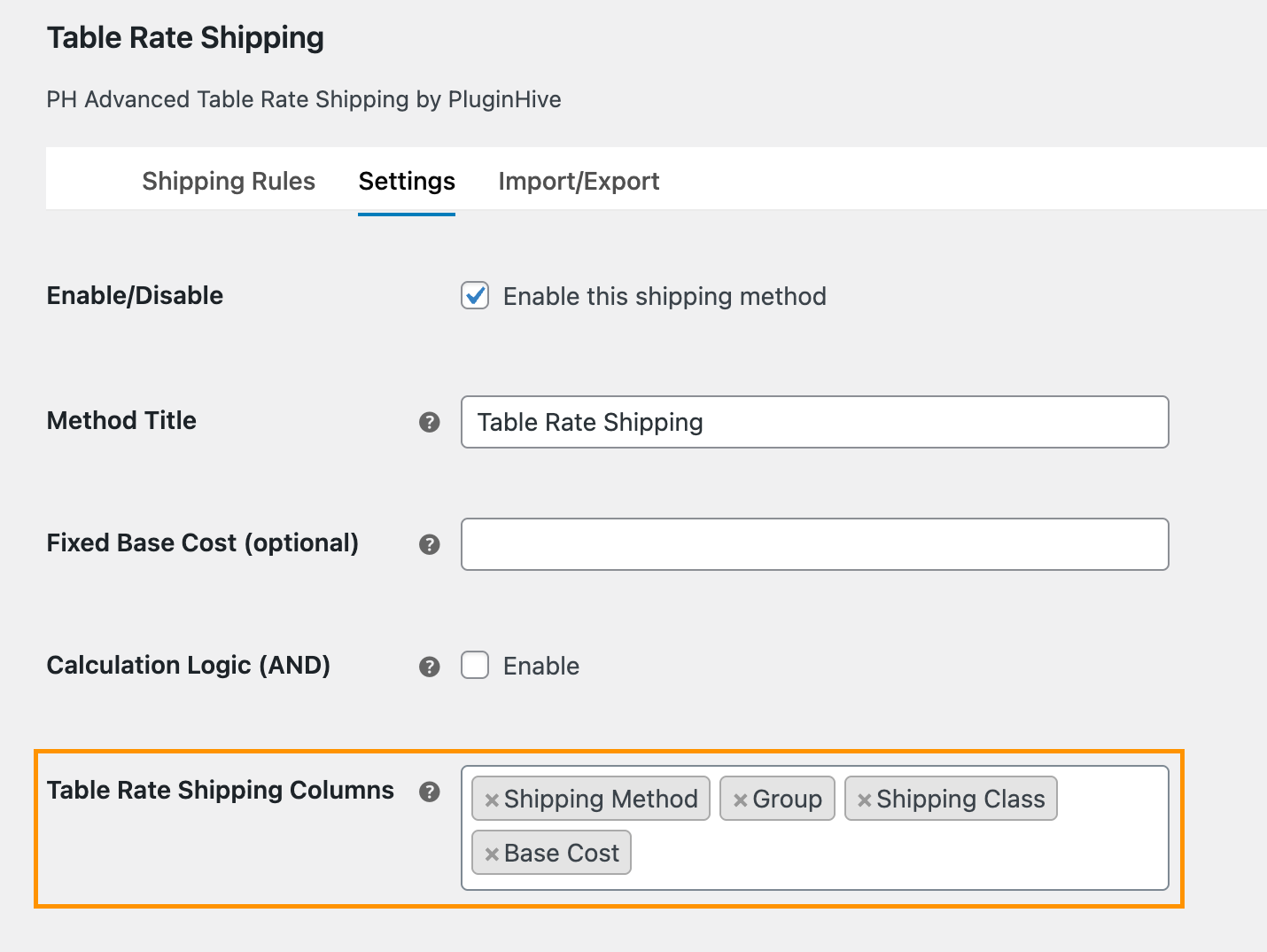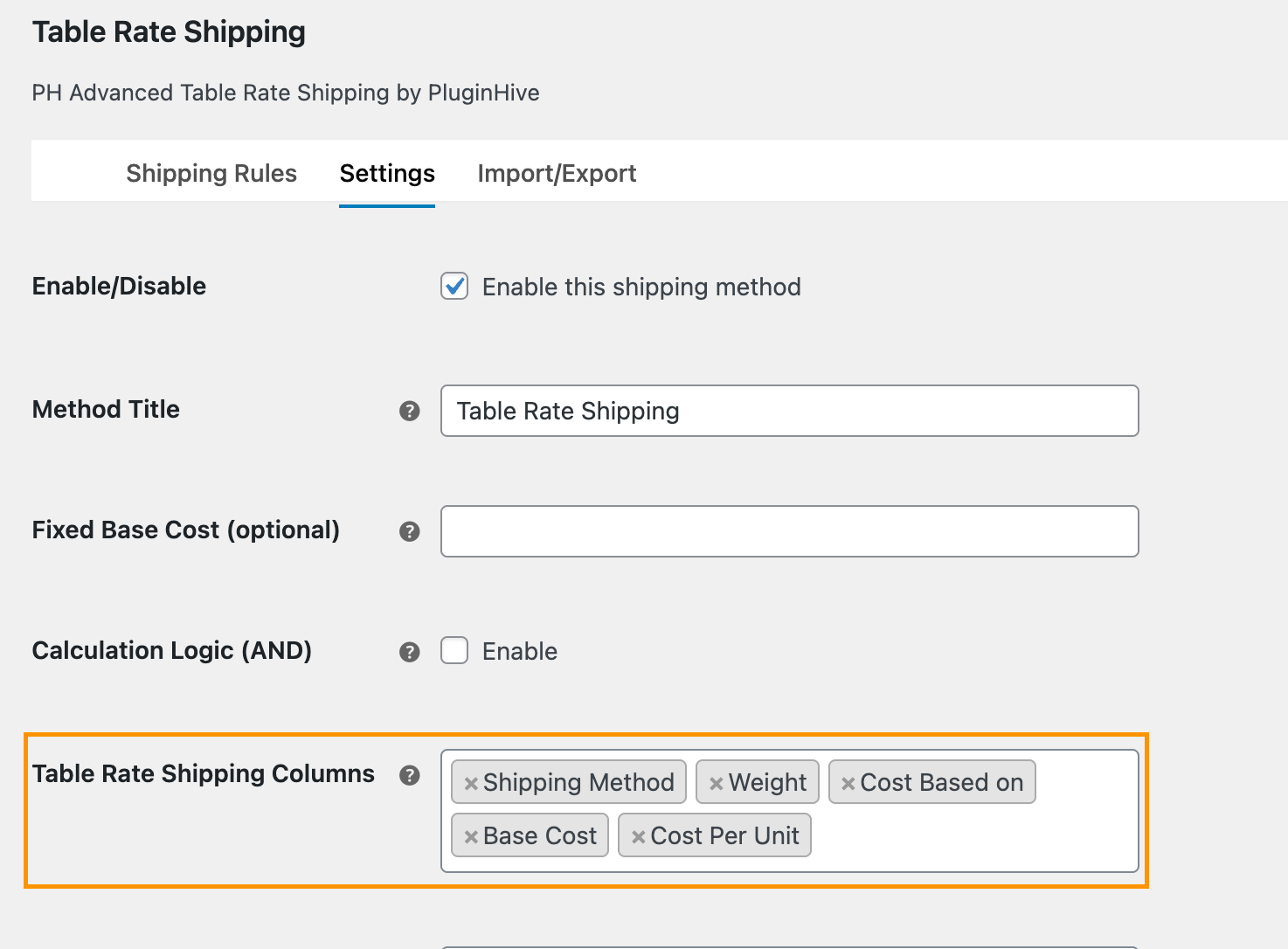 Now, go to Table Rate Shipping โ Settings and in the Table Rate Shipping Columns, select: