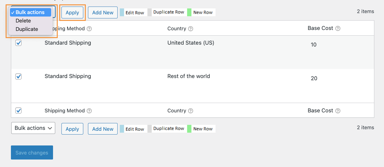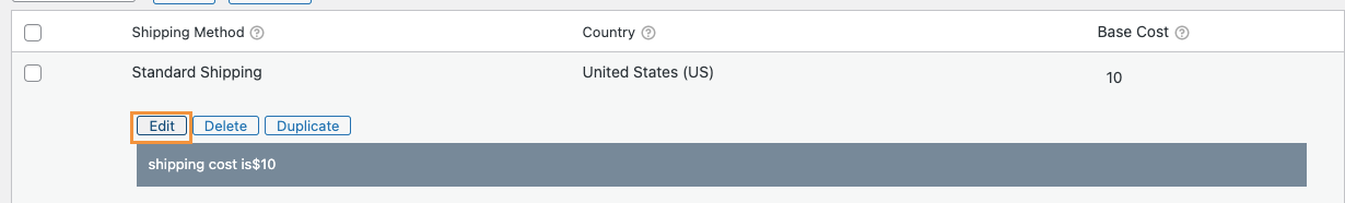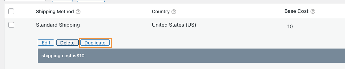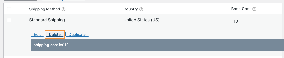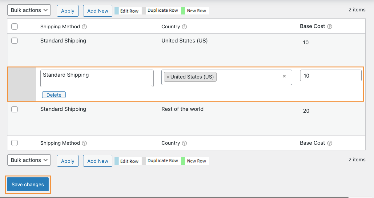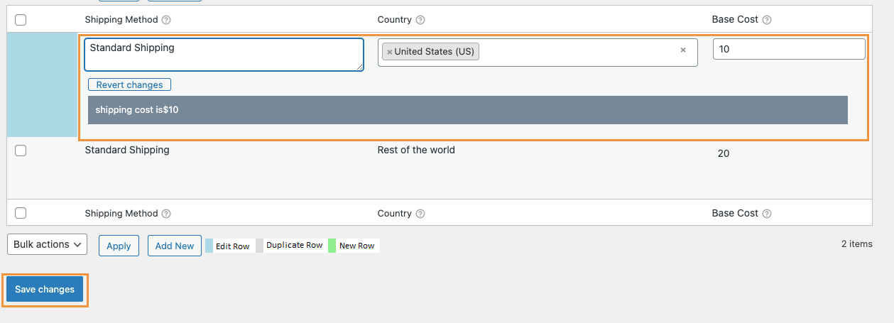 Suppose you want to charge $10 for shipping within the United States and $20 for all other countries. To do this, create one rule where the Country is set to the United States and the Base Cost is $10. Then create a second rule where the Country is set to Rest of the World, and the Base Cost is $20.