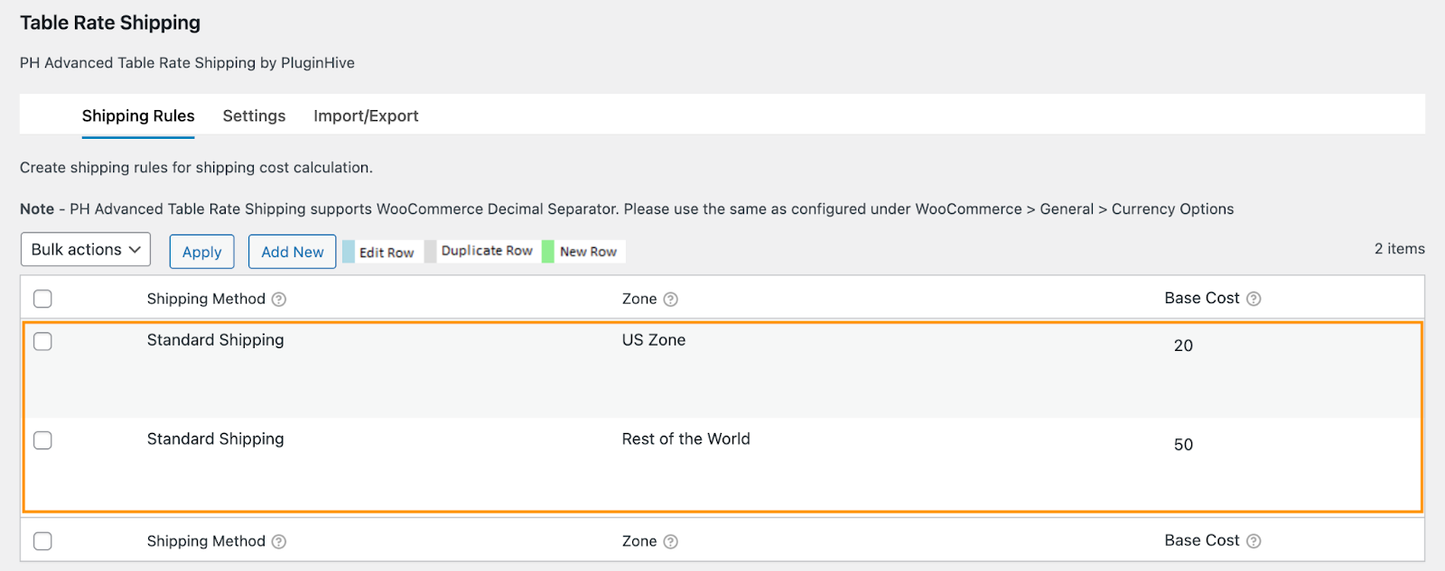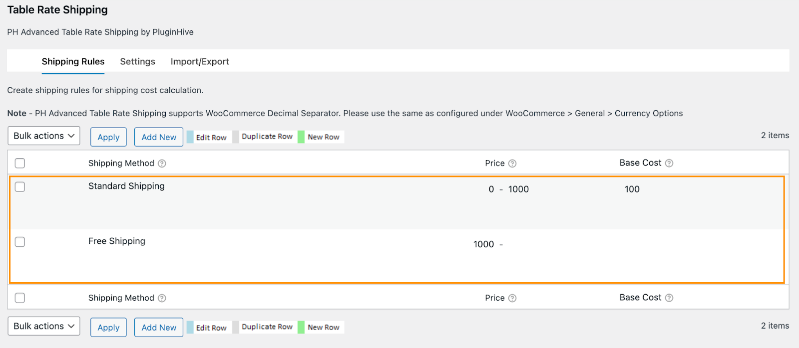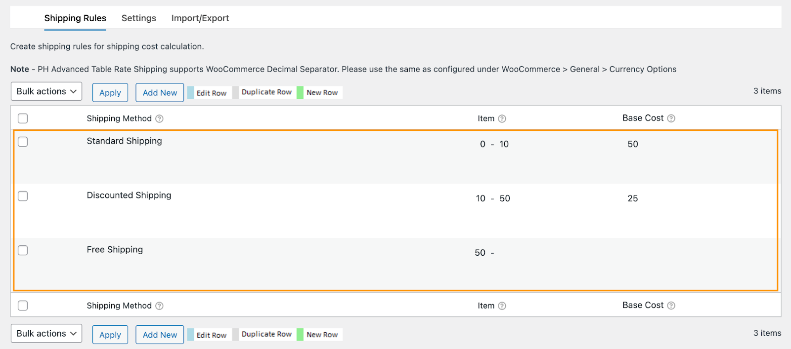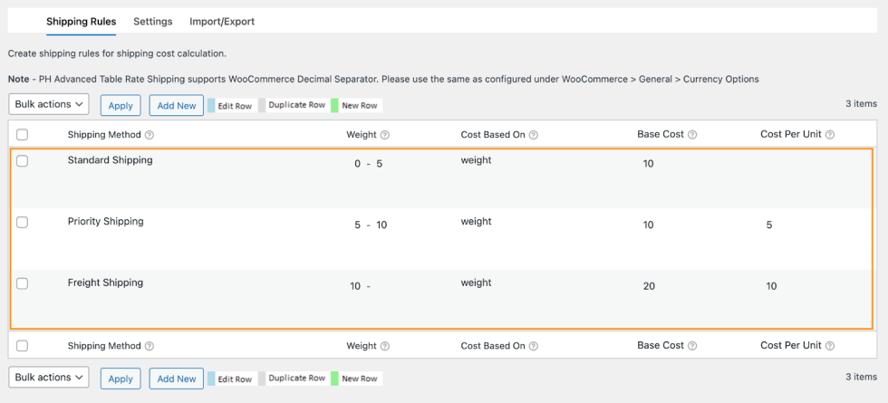 ↑ Back to topThe Shipping Rules tab is where you create the actual shipping rate calculations. Each row in the rate table represents a rule that defines when a shipping rate should apply and how much to charge.