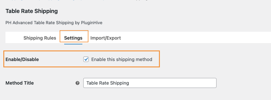 On the Table Rate Shipping page, switch to the Settings tab and enable the option Enable this shipping method. This ensures that Table Rate Shipping is available for use on your storeโs Cart and Checkout pages.
