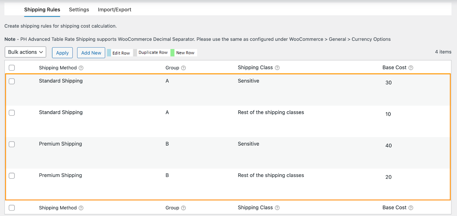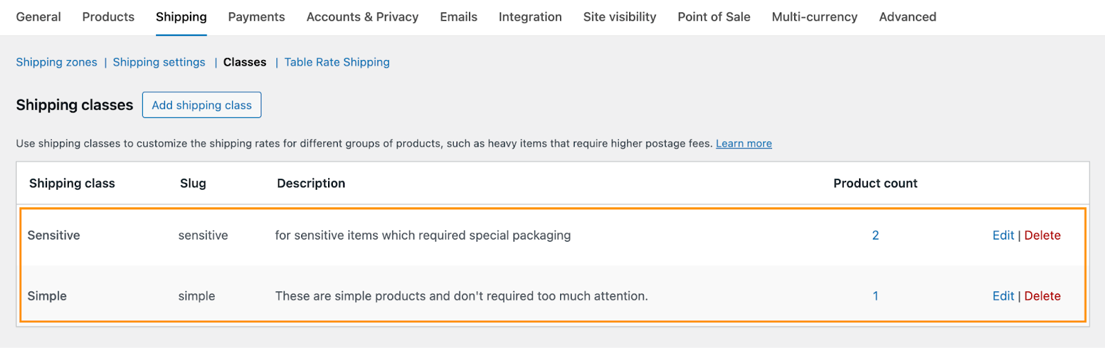 ↑ Back to topSome products, such as fragile or sensitive goods, require extra packaging and careful handling. By using Shipping Classes and Groups, you can charge higher shipping rates for these items while keeping standard products at regular rates. For example: