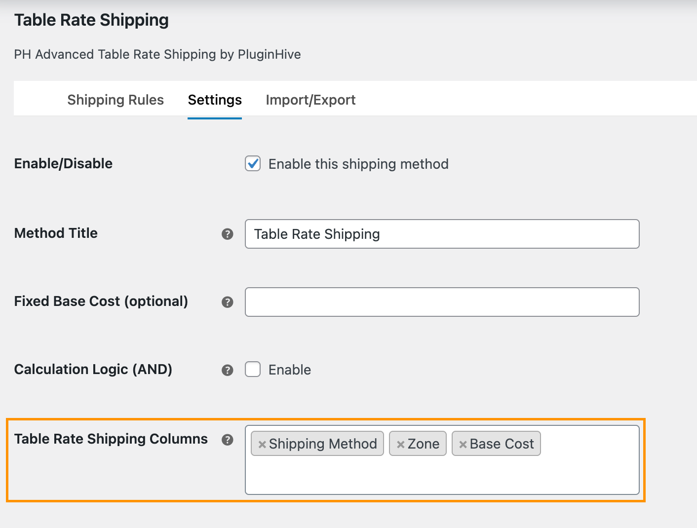 In the Table Rate Shipping Columns, select: Shipping Method, Zone, and Base Cost
